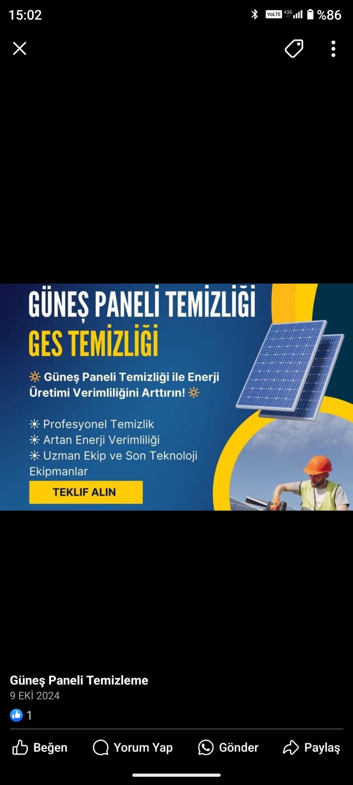 14 Yılı aşkın tecrübemiz temizlik alanında müşteri odaklı çalışıyoruz. Güneş paneli temizleme, ges panel temizliği, solar panel temizleme, güneş paneli yıkama alanlarında tecrübeliyiz.